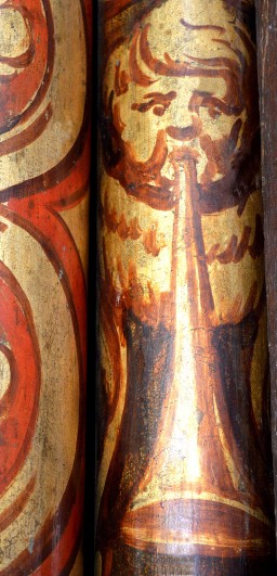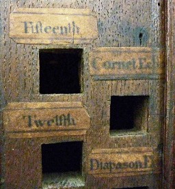 Although the organ received a new console in 1872, placed at the side of the case, the jambs and stop-labels of the original console survive on the front of the case.
